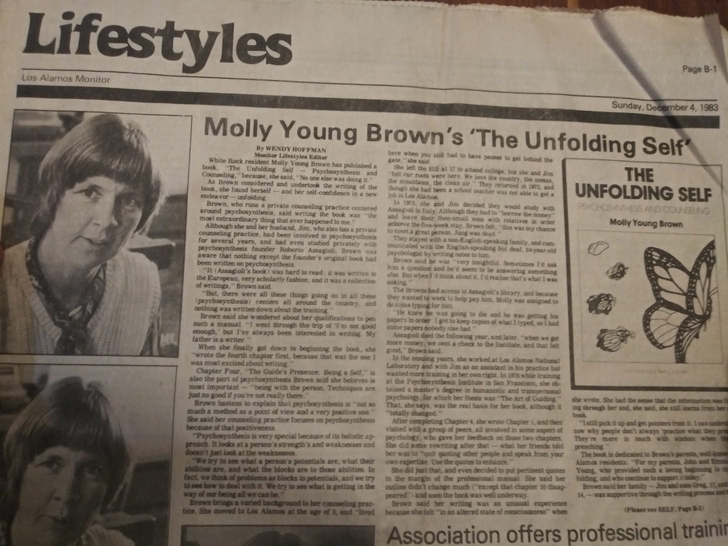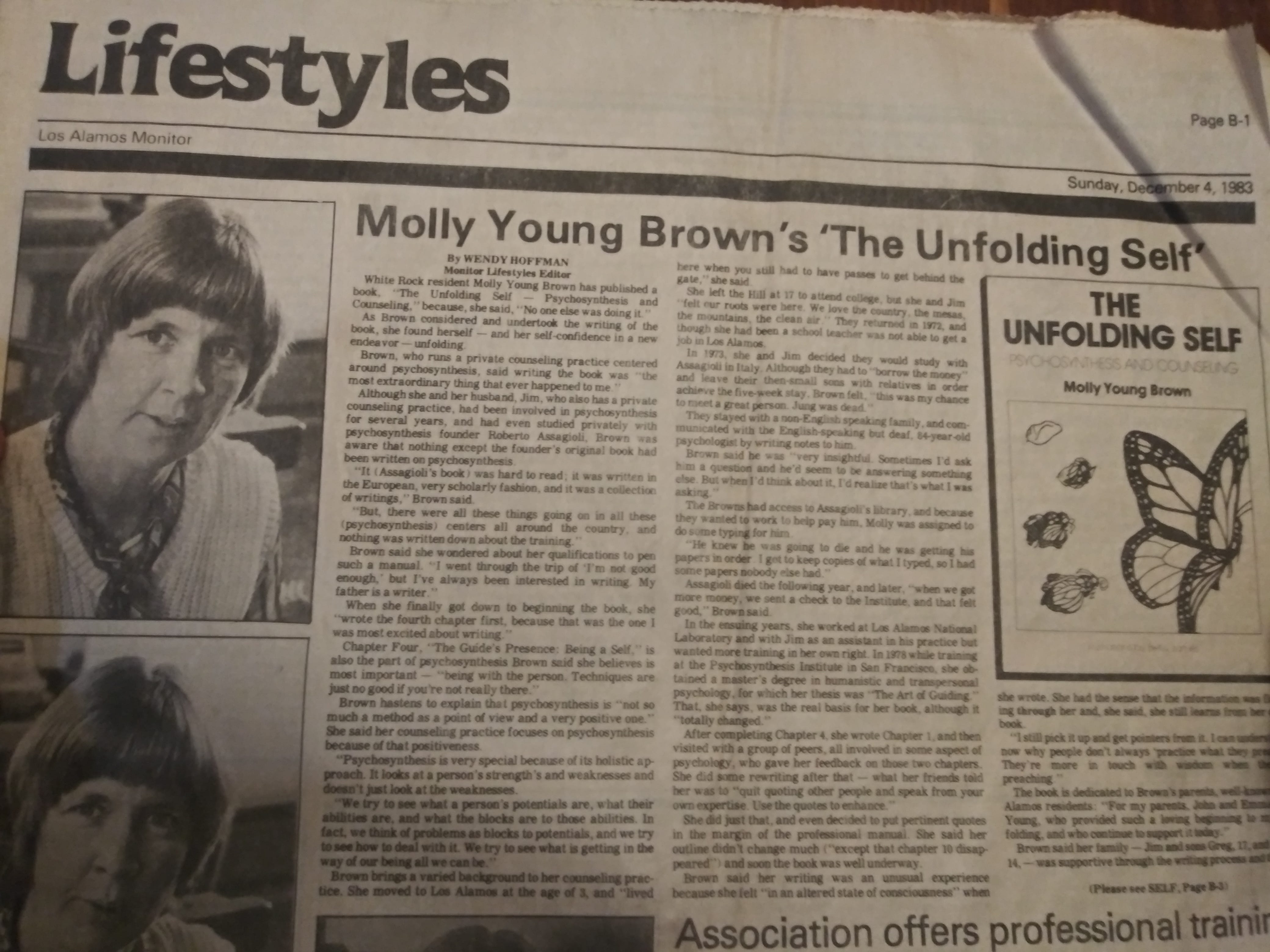 (Molly) I gradually developed an individual psychosynthesis counseling practice, mostly working in the Room. There was no licensing for mental health counselors in New Mexico at that time, only for clinical psychologists with PhDs. To keep out of trouble, I was careful not to call myself a therapist or even a counselor (“life coach” wasn’t an option yet). I presented my work as “psychosynthesis guiding, an educational process that people can apply to their lives as they choose.”